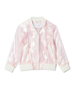 Beautiful classic, sheer bomber jacket adorned with a ruffled tulle detail on the sleeves.